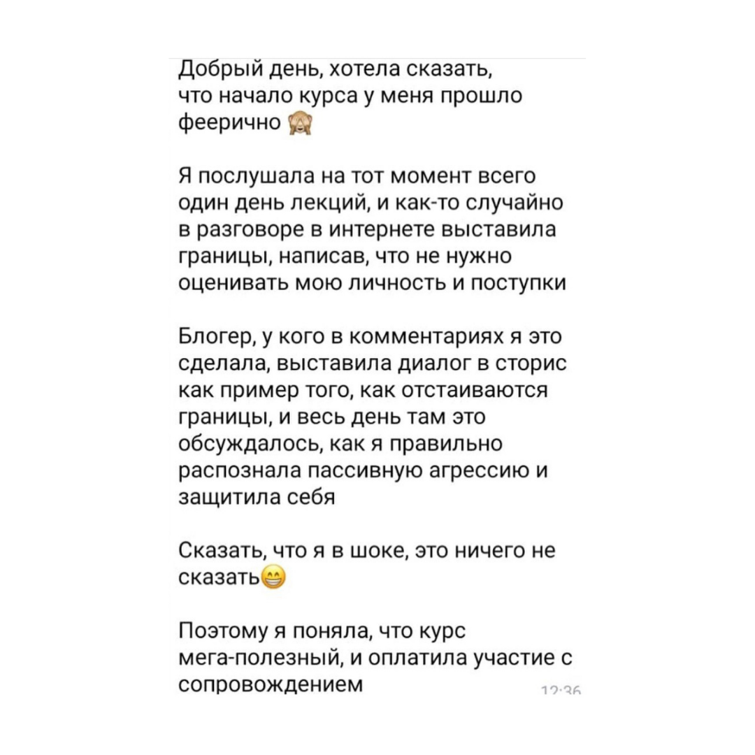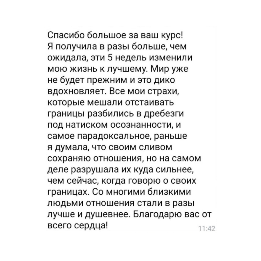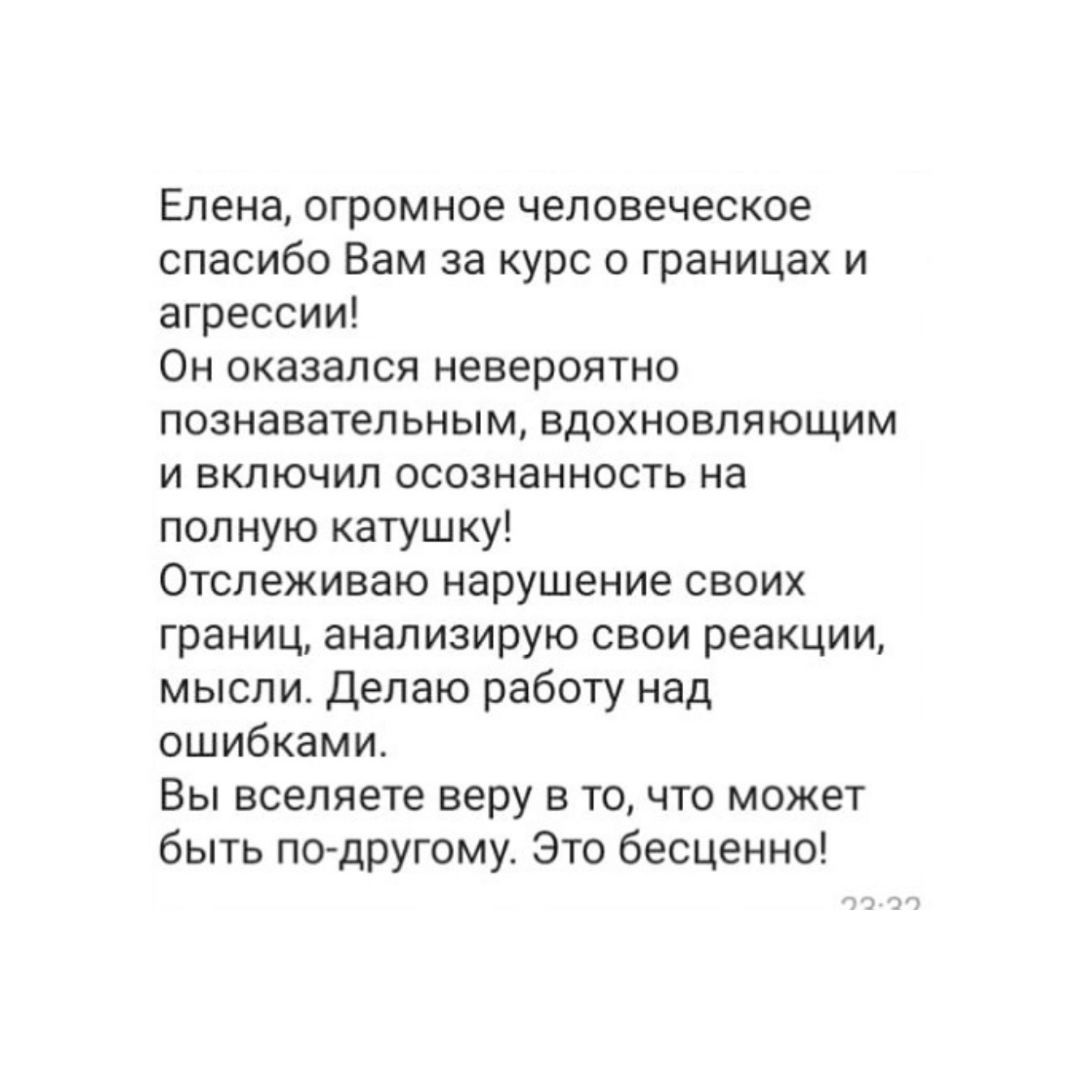 - научитесь защищать свои границы - узаконите адекватную агрессию в своей жизни - выстроите уважительные отношения с людьми - научитесь отказывать, говорить "нет", "не хочу", "это не мое" - поймете, где вы нарушаете границы других людей - выйдете из семейных психологических игр - сделаете огромный шаг к психологической зрелости и счастью