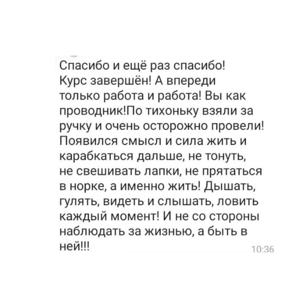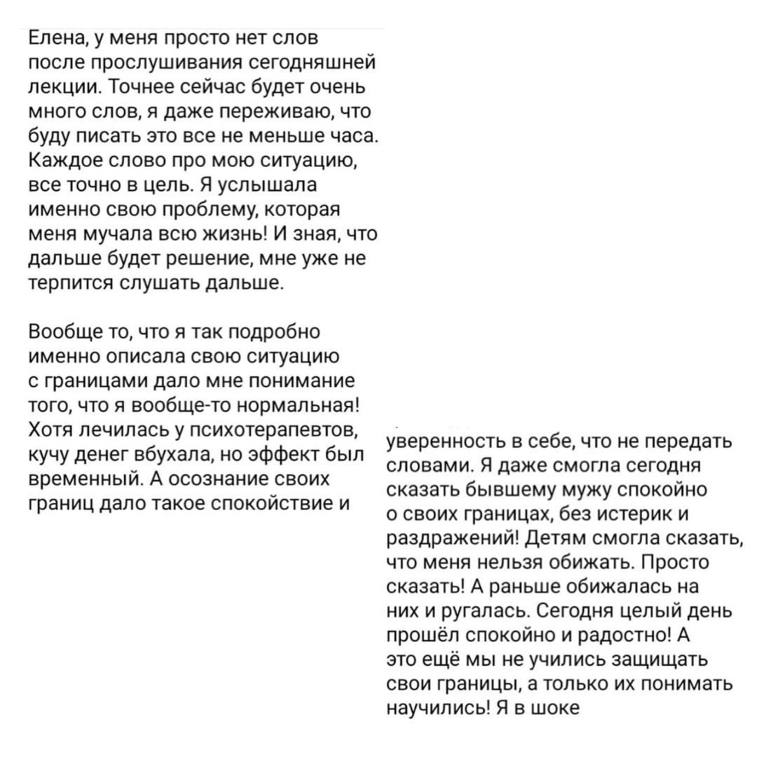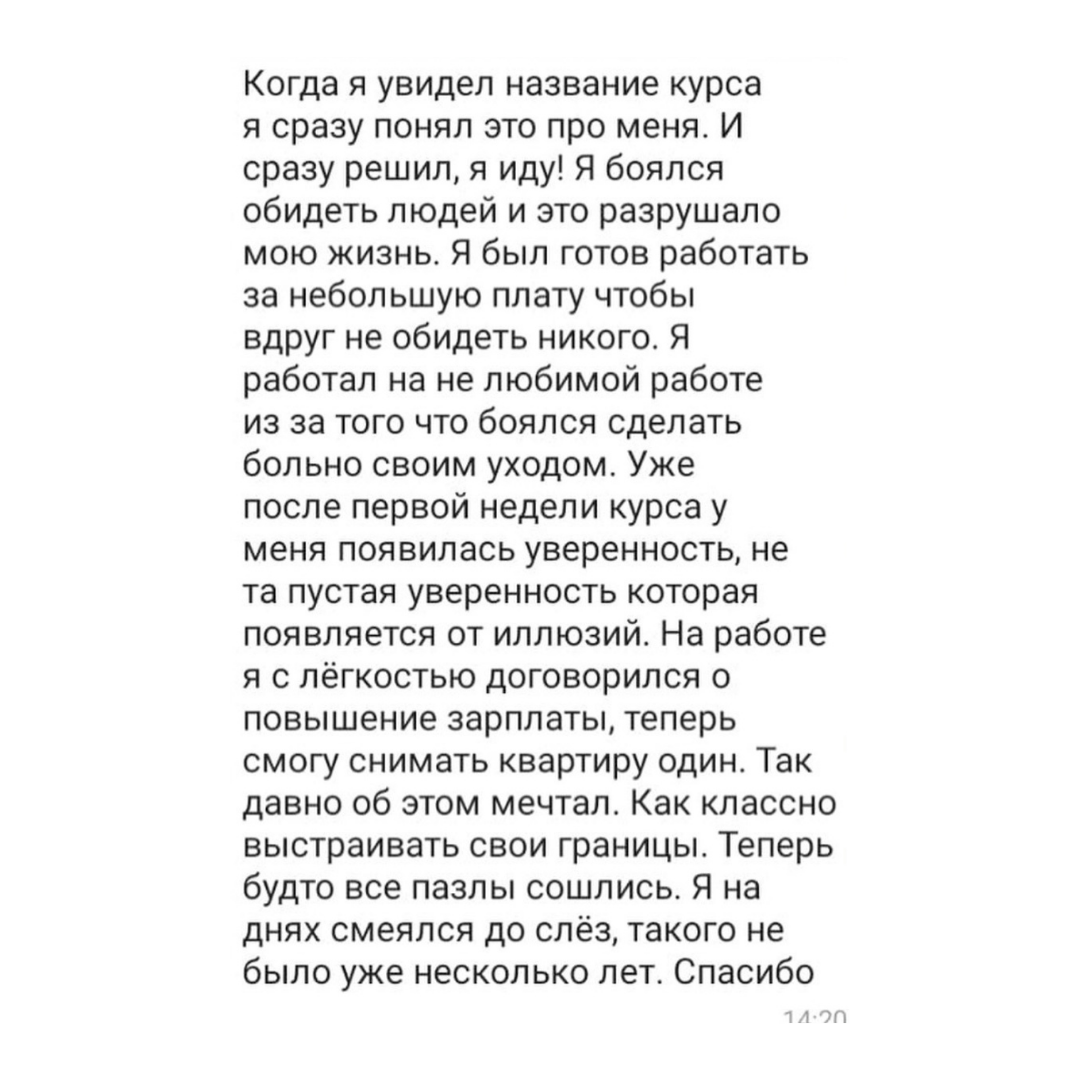 - научитесь защищать свои границы - узаконите адекватную агрессию в своей жизни - выстроите уважительные отношения с людьми - научитесь отказывать, говорить "нет", "не хочу", "это не мое" - поймете, где вы нарушаете границы других людей - выйдете из семейных психологических игр - сделаете огромный шаг к психологической зрелости и счастью